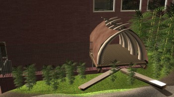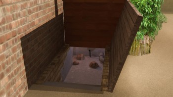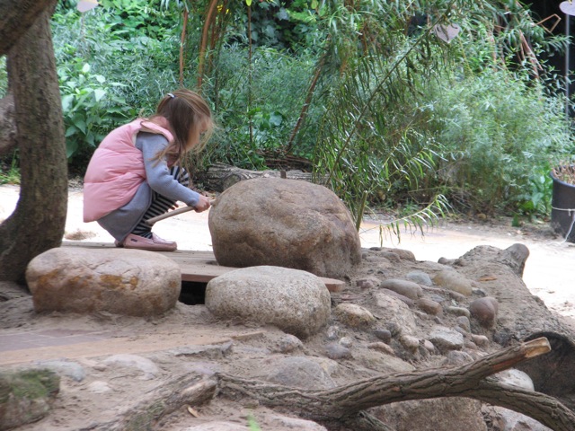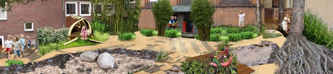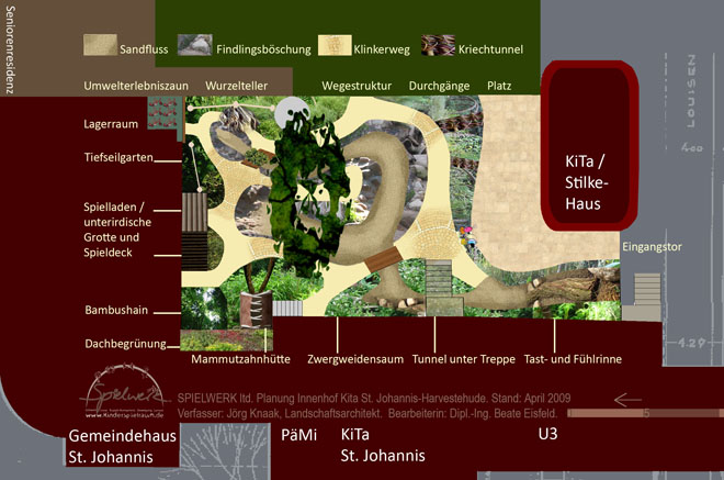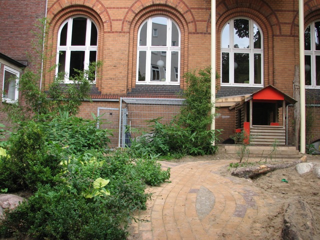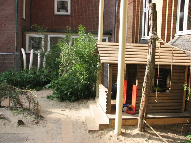 Rollenspiele und konzentriertes Spiel. Die Raumgröße des Hofes wurde optimiert, indem die bislang mit hohen Schutzzäunen umgebenen Kellertreppen überbaut und zugänglich gemacht werden. Einzigartige Spielsituationen ergeben sich hier aus einem bisherigen Manko der Architektur. Statt verstörender Gitterräume, die Spielfläche wegsperren, entstehen anregende Stationen.