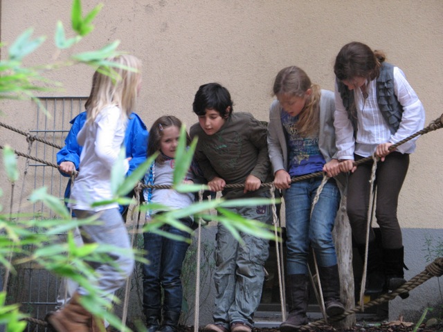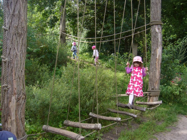 Tiefseilgärten mit schlappen Seilen stellen eine wichtige Vielfalt an motorischen Angeboten dar. Wenn man alleine über die Dschungelbrücke wackelt ist es schon was besonderes, aber schwierig ist das Hangeln oder das Balancieren über Fußseile. Die nächste Slagline-Generation kommt bestimmt.